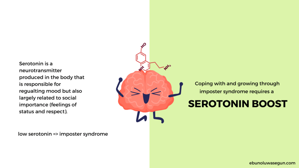 Speaking of the body, there is a neurotransmitter called serotonin in the human body that is linked to imposter syndrome. Serotonin, amongst all its functions in the body, is responsible for regulation of your mood and also associated with feelings of social importance – status and respect. Your mood consists of how you feel at a certain point in time (or a temporary state of mind or feeling),e.g joy, sadness, etc and so imposter syndrome expresses itself through your mood, hence why you feel the feelings of fear, doubt, incompetence, etc.