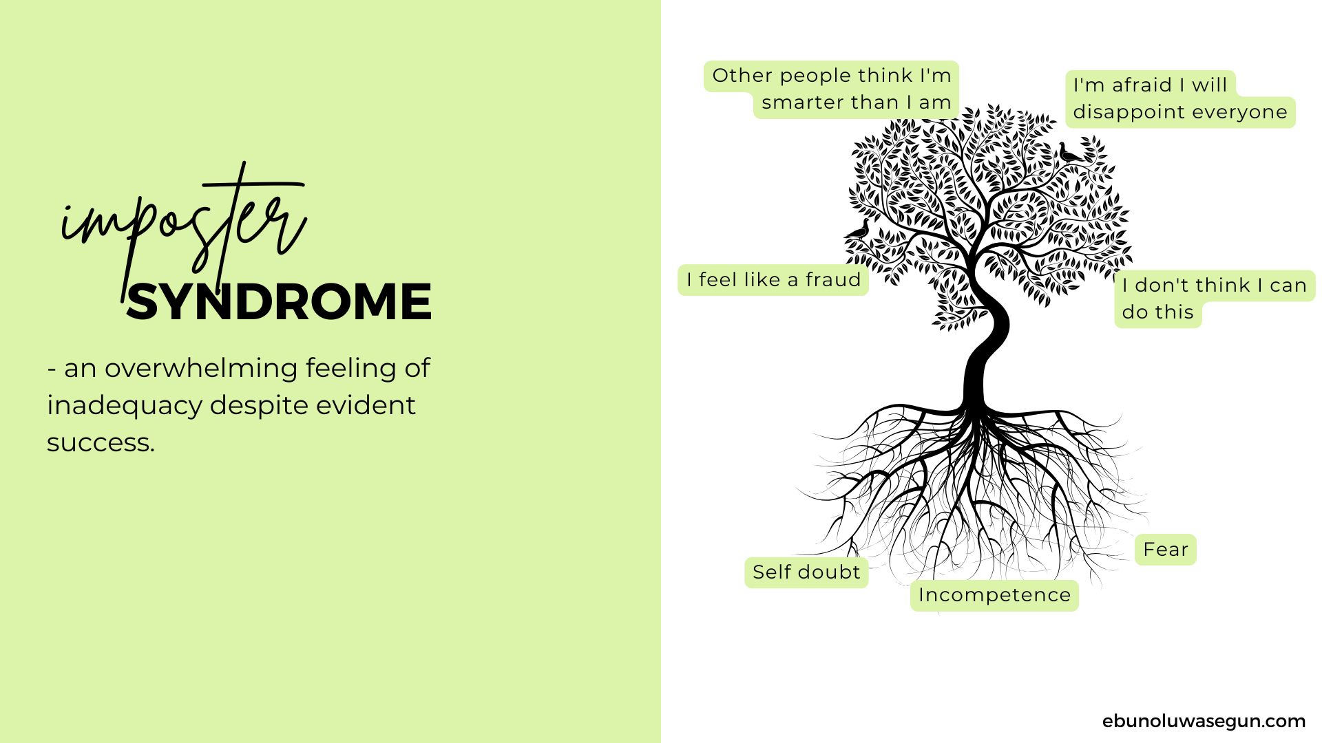 The three circles in the diagram above denote a person’s zones of work/performance. The smallest zone, the comfort zone, is the zone of neutral performance where you can do your job in your sleep but at this stage, you’re not gaining any new skills. In the growth zone (also known as the learning zone), you are attempting to gain new skills and grow in your craft. As we can see, there is a weird zone that exists between the comfort zone and the growth zone, and this is where imposter syndrome lives. Thus, we can say that imposter syndrome is at the bridge between your zone of neutral performance and your zone of gaining new skills. More importantly, imposter syndrome is a tool that our body uses to alert us that we are approaching the growth zone. Because of how uncomfortable this is, we can choose to retreat to the comfort zone or stick it through just like you are doing with this article and press on to the growth zone.